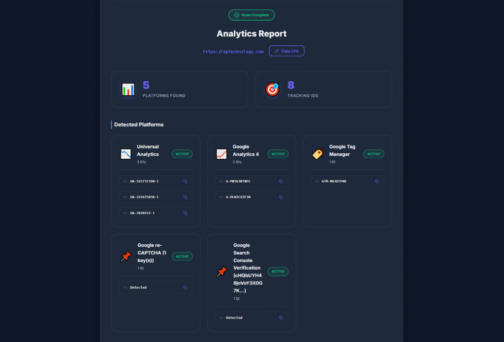 The Google Analytics Checker is a free web application that scans any website and instantly reveals: