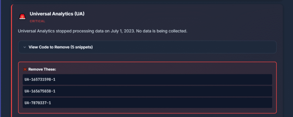 • Identify legacy Google Analytics (Universal Analytics) that’s no longer supported